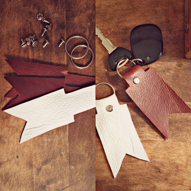 I am a bit fan of working with leather- I love it- there is something that whispers "this is special" about leather. Maybe it is the historical pedigree of leather- it is an ancient and honest material that is tried and true. Perhaps it is the social connotations that leather equals quality goods- I learned at an early age to sniff purses to tell if they were made of leather or not- quality purses are made of leather! Impress all your friends this Holiday season with these arrow inspired key chains- cause you know arrows are super hip right now.